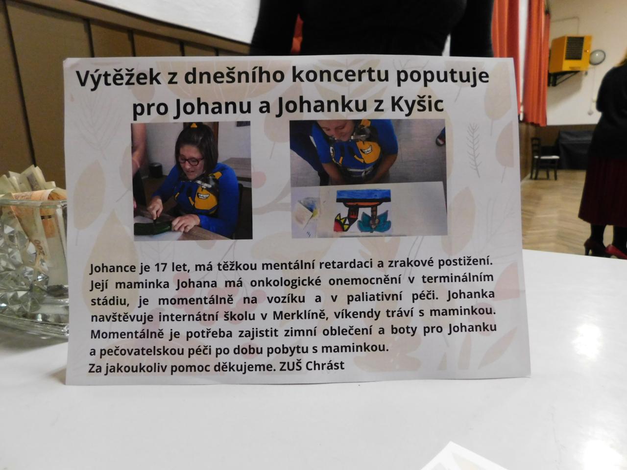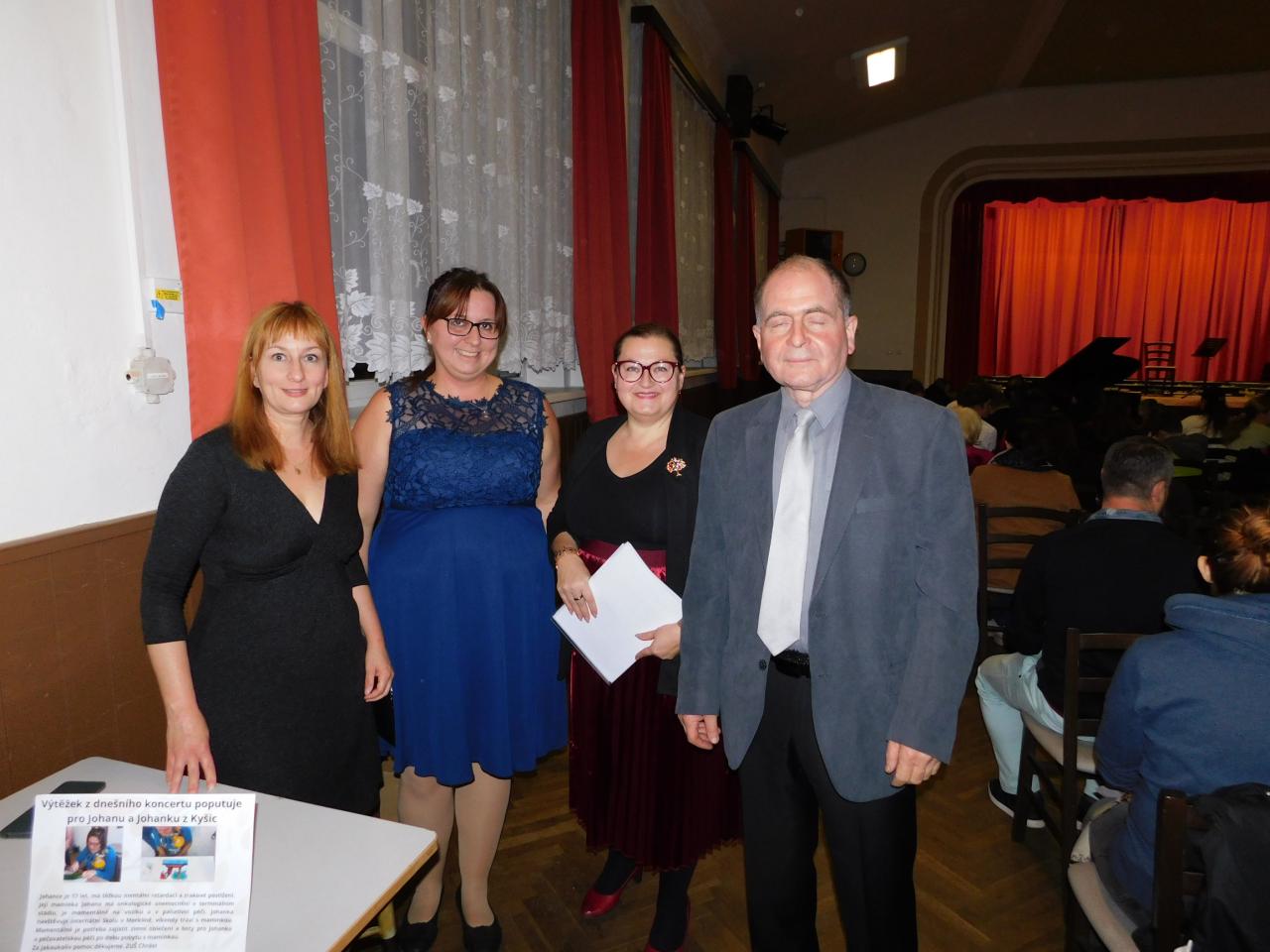 Koncert měl navíc charitativní rozměr – vybraný výtěžek 5780,- korun byl věnován Johance a její mamince z Kyšic. Děkujeme všem, kteří přispěli a podpořili tak dobrou věc. Velké poděkování patří také účinkujícím žákům, pedagogům i návštěvníkům, kteří vytvořili příjemnou a přátelskou atmosféru.