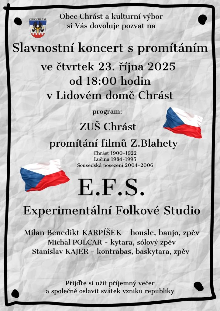Ve čtvrtek 23. října 2025 se v Lidovém domě v Chrástu uskutečnil slavnostní koncert s promítáním pořádaný obcí Chrást a kulturním výborem.